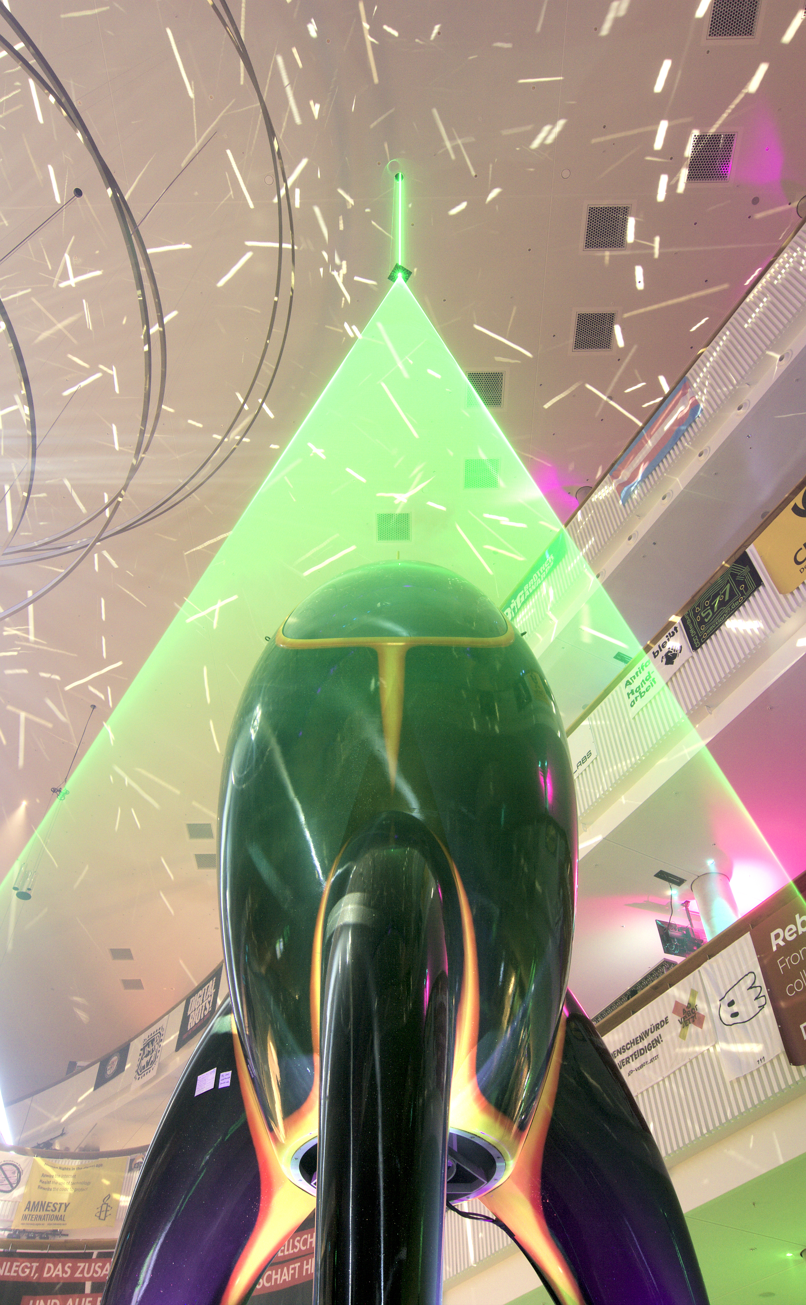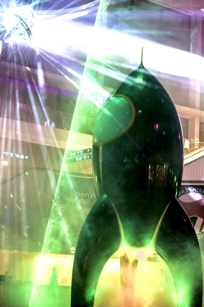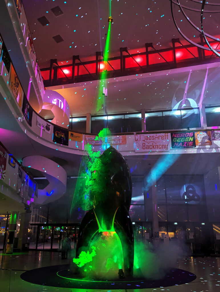 Die Installation „Rocket Portal“ verbindet einen raumgreifenden Kegel aus Laserlicht und Nebelwolken zur Illusion des Starts der Rakete Fairydust (dem Symbol der CCC Veranstaltungen) in neue Dimensionen. Durch Drücken eines Buzzers konnten die Teilnehmenden interaktiv ein Startsequenz auslösen. Die Positionierung im Hauptfoyer der Eingangshalle verabschiedete (oder begrüßte) die Teilnehmenden in die Nacht.