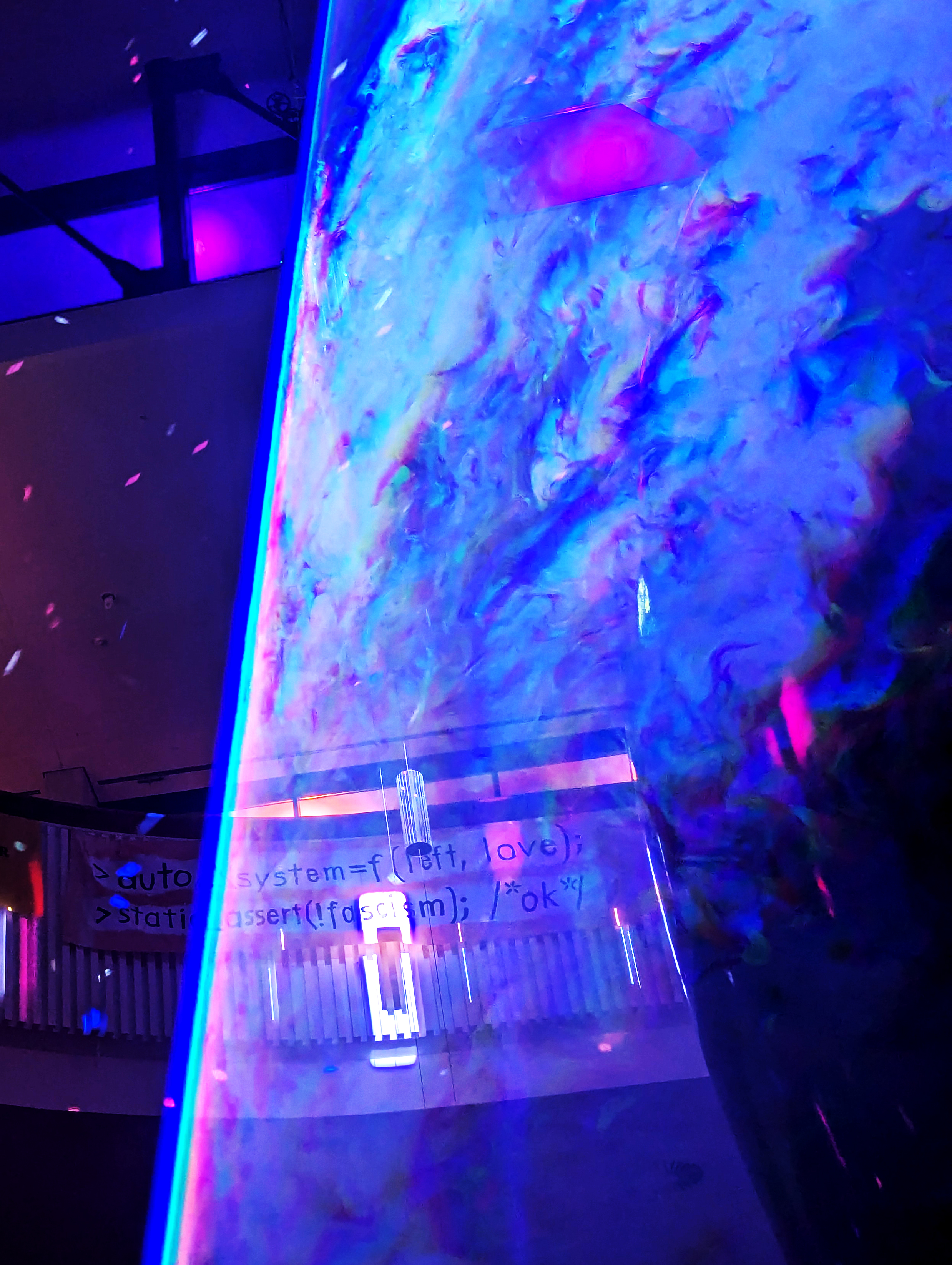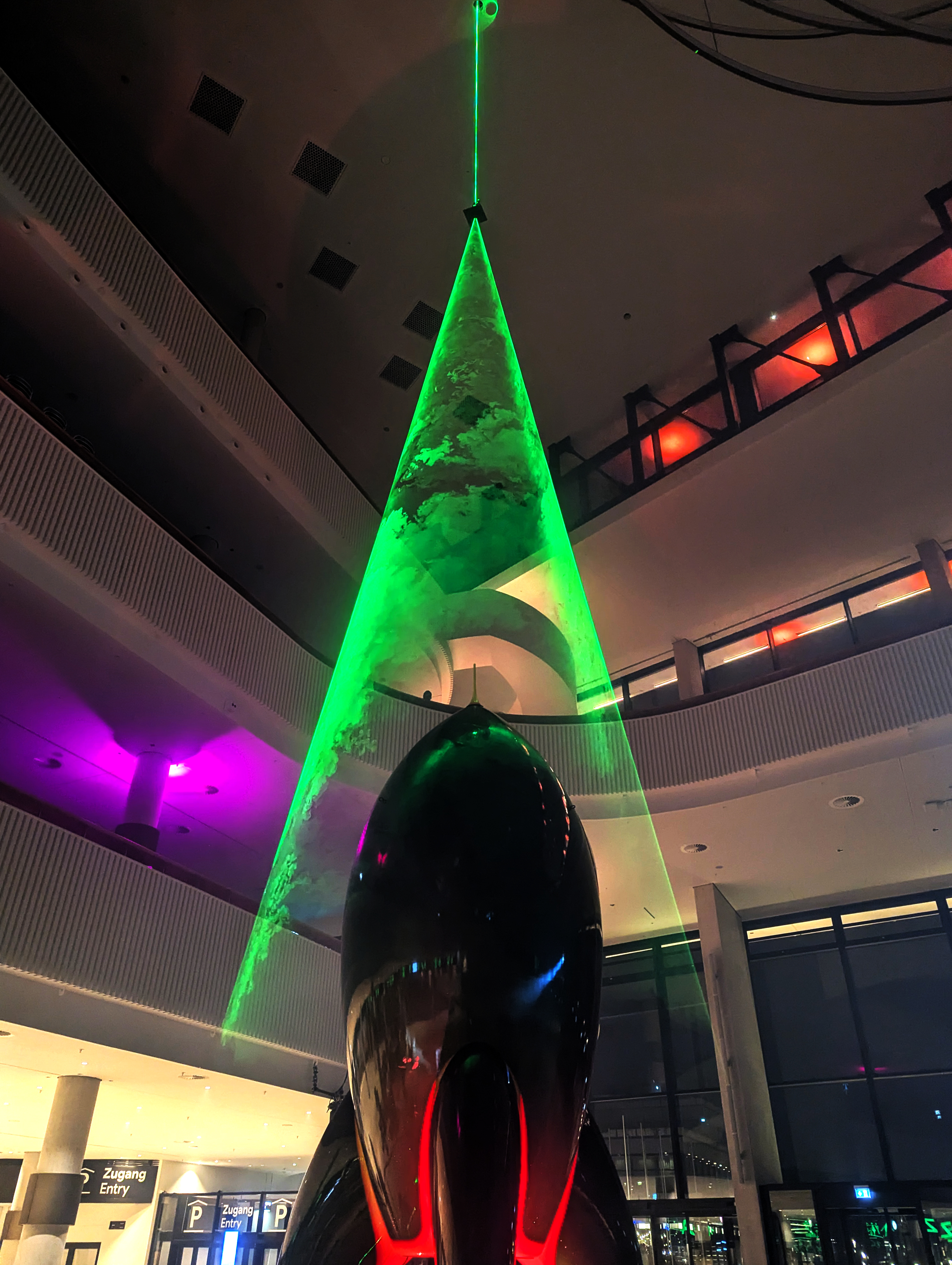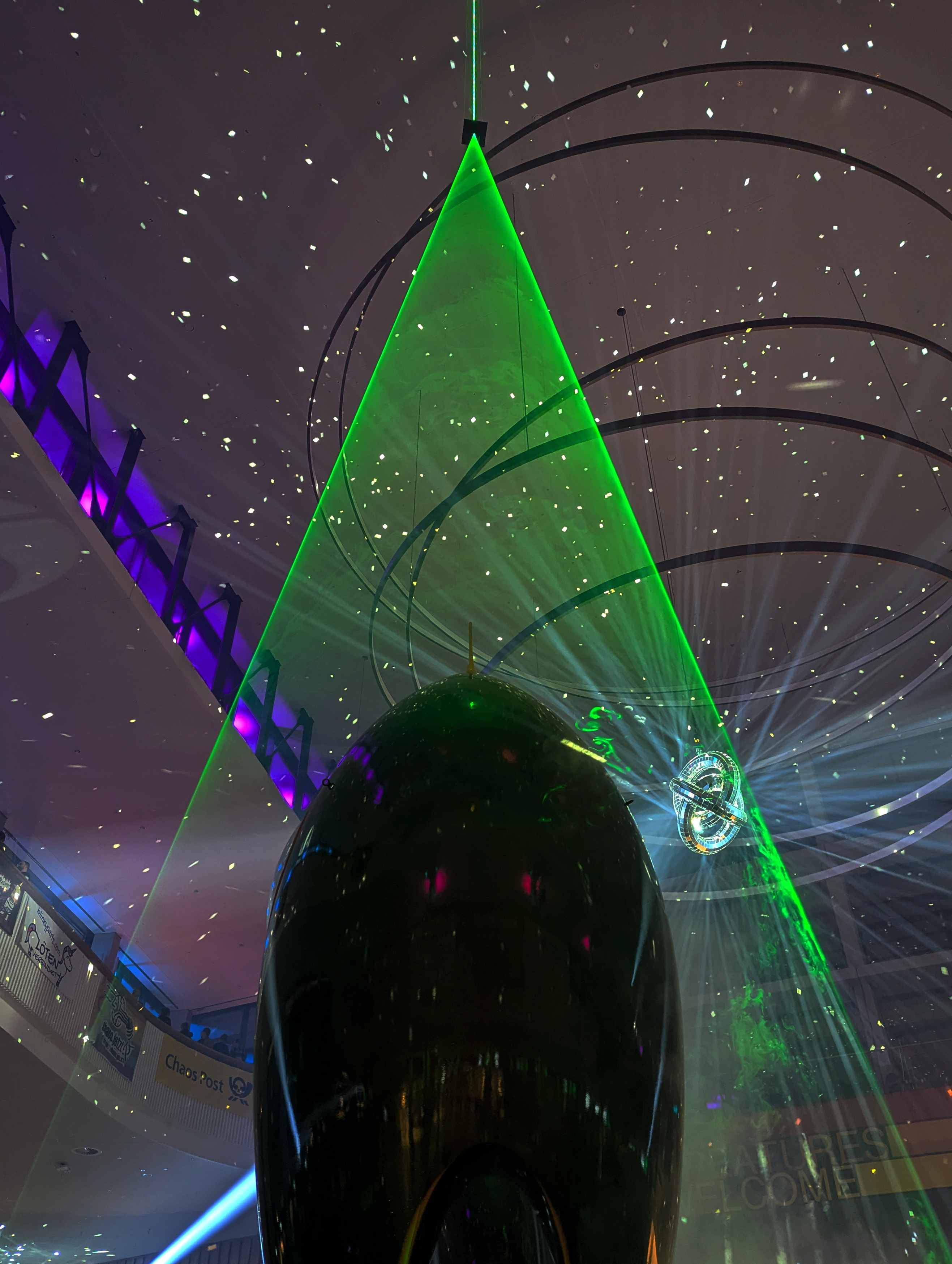 Die Installation „Rocket Portal“ verbindet einen raumgreifenden Kegel aus Laserlicht und Nebelwolken zur Illusion des Starts der Rakete Fairydust (dem Symbol der CCC Veranstaltungen) in neue Dimensionen. Durch Drücken eines Buzzers konnten die Teilnehmenden interaktiv ein Startsequenz auslösen. Die Positionierung im Hauptfoyer der Eingangshalle verabschiedete (oder begrüßte) die Teilnehmenden in die Nacht.