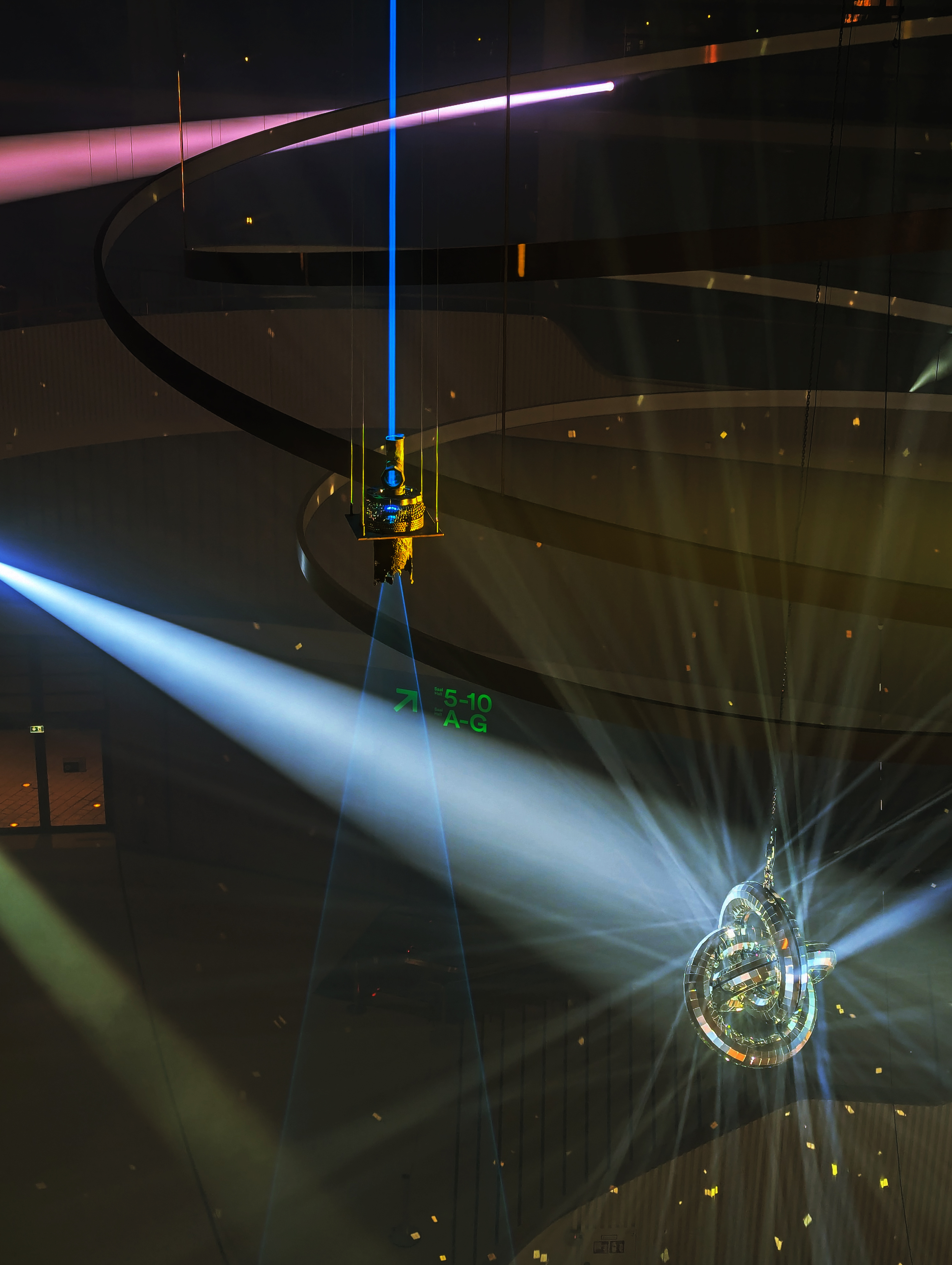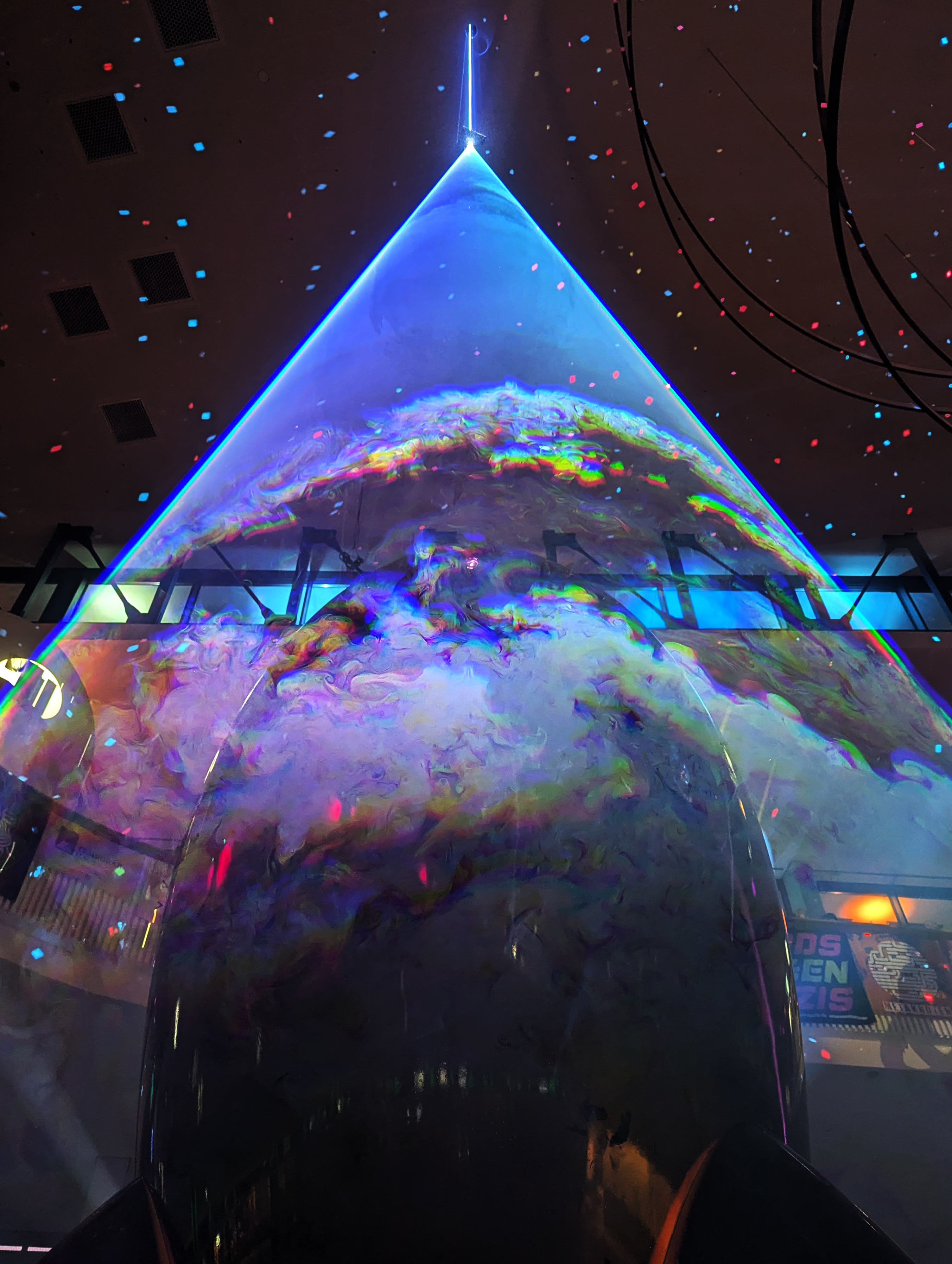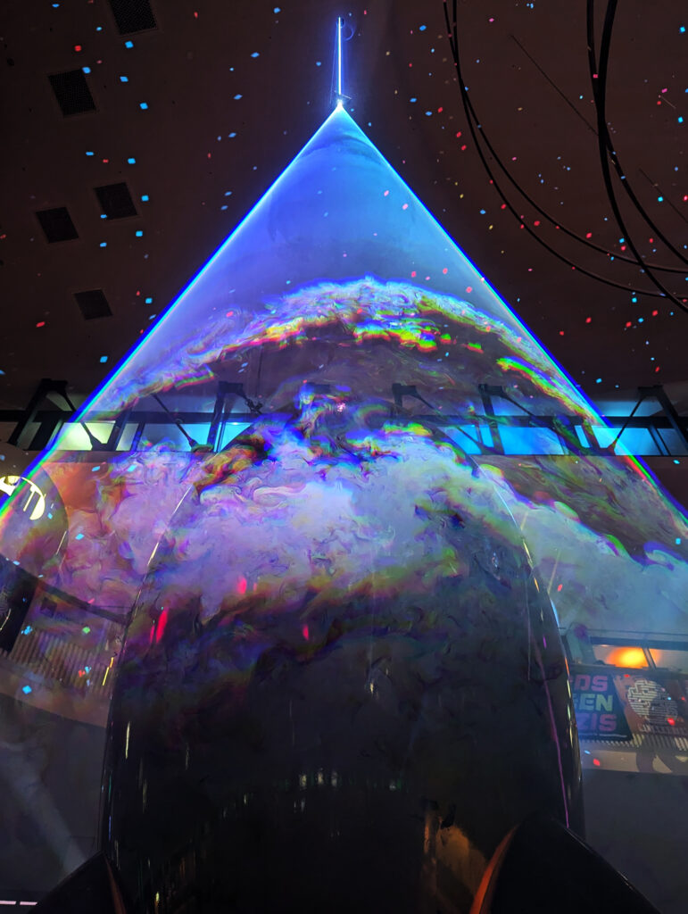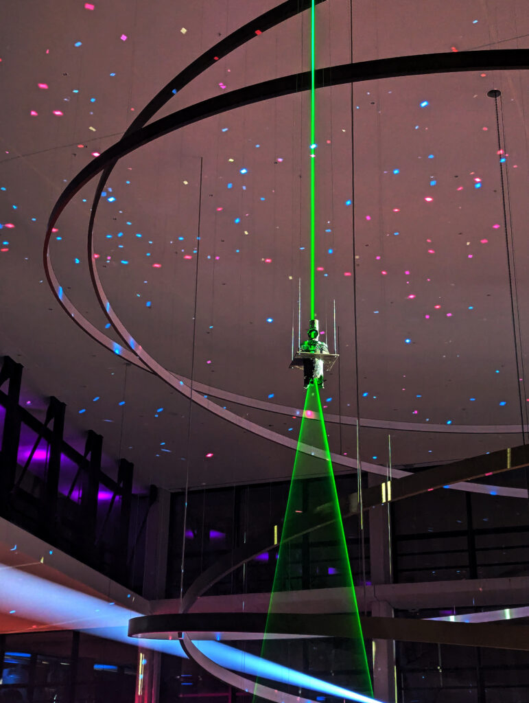 Der Effekt entsteht zu großen Teilen rein optisch. Der aus der Decke fallende Laserstrahl trifft in der geflogenen Wurmlochgenerator Skulptur auf eine spezielle Linse. Dadurch entstehen einige Sicherheitsvorteile. Unter anderem gibt es keine mechanischen Teile, die ausfallen und stehende Strahlen erzeugen können. Außerdem wird die Energie dadurch so verteilt, dass bereits nach kurzer Entfernung die Laserleistung, in einem Bereich liegt in dem der Lidschlußreflex schnell genug ist das Auge zu schützen bevor Schäden entstehen. Dadurch ist ein Projektion in den Publikumsbereich möglich und erlaubt den Teilnehmen den Lichtkegel zu betreten und aus nächster Nähe mit dem Laser zu interagieren.